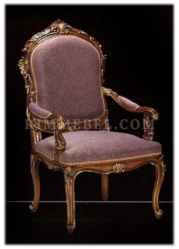 Стул с подлокотниками, мягкие сидение и спинка, подлокотники с мягкими накладками (возможен вариант стула без подлокотников). Наполнение - полиуретан. Декорирован резными элементами. Возможны другие варианты отделки и обивки.