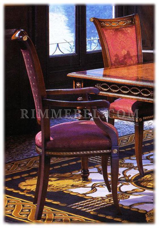 Стул с подлокотниками, мягкие спинка и сидение. Наполнение - полиуретан. Декорирован резными элементами. Возможны другие варианты отделки и обивки, в том числе выполнение в ткани клиента