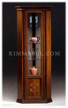 Витрина одностворчатая угловая. Полки выполнены из стекла. Инкрустированный фасад. Возможны различные варианты отделки