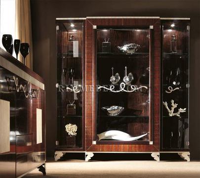 3-х дверная витрина, декорирована кожей. Полки выполнены из стекла. Возможны другие варианты отделки.