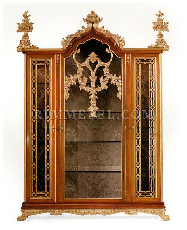 1-дверная витрина, полки выполнены из стекла, задняя стенка выполнена в отделке из ткани. Декорирована резьбой ручной работы.