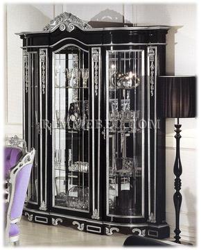 3-х дверная витрина, полки выполнены из стекла. Задняя стенка зеркальная, а также возможен вариант деревянной или обшитой тканью стенки. Декорирована резьбой. Возможны различные варианты отделки (красное дерево, декапе, крашенное в различные цвета, медный лист или напыление, и т.д.)