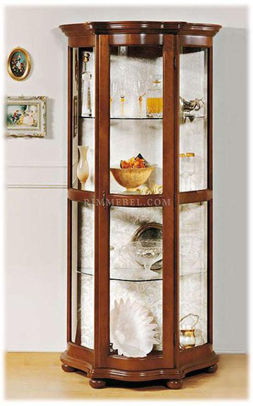 Полукруглая 1-дверная витрина, полки выполнены из стекла. Задняя стенка обшита тканью, а также возможен вариант деревянной или зеркальной стенки. Возможны различные варианты отделки (красное дерево, декапе, крашенное в различные цвета, медный лист или напыление, и т.д.)