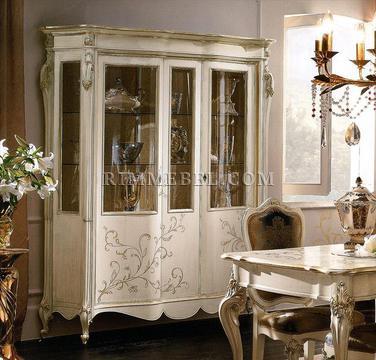 2-х дверная витрина. Полки выполнены из стекла, задняя стенка обита тканью. Декорирована резными элементами. Возможны другие варианты отделки.